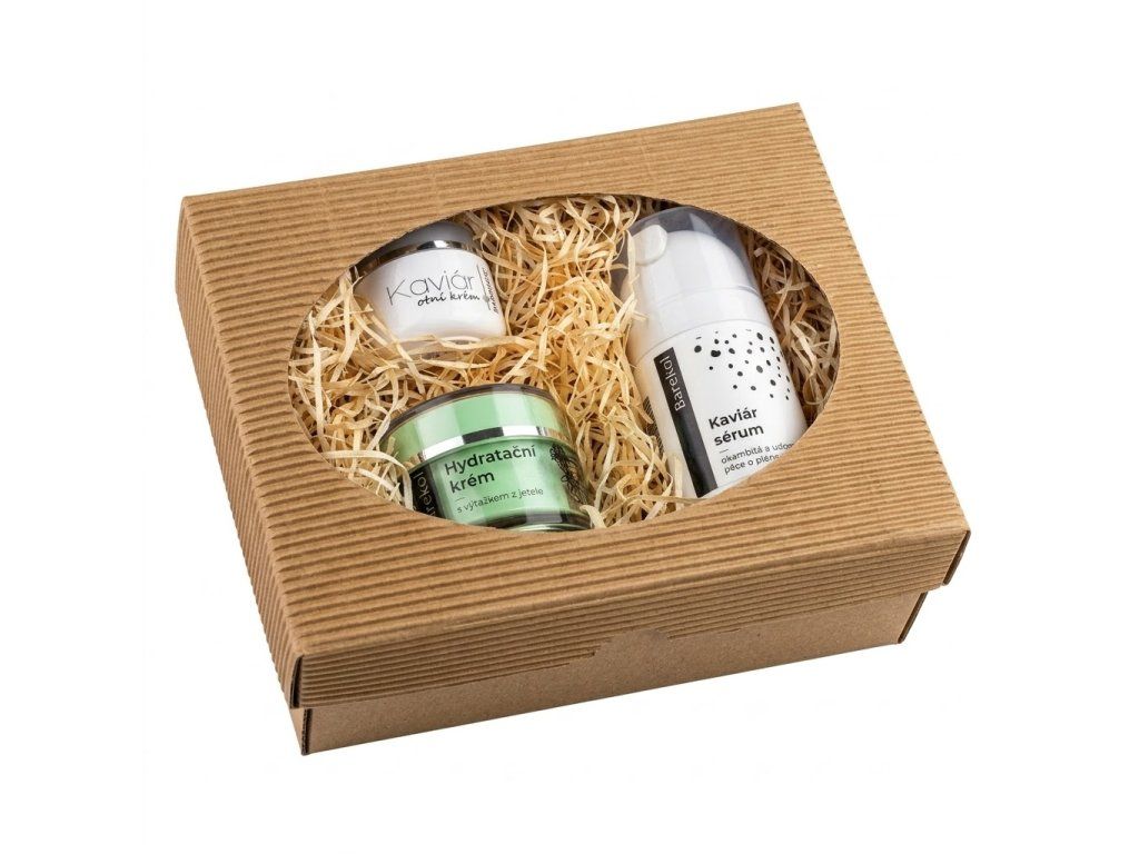 - hotová dárková krabička s LUXUSNÍM HYDRATAČNÍM KRÉMEM s výtažkem z jetele a kyselinou hyaluronovou, Kaviár očním krémem a Kaviár sérem
